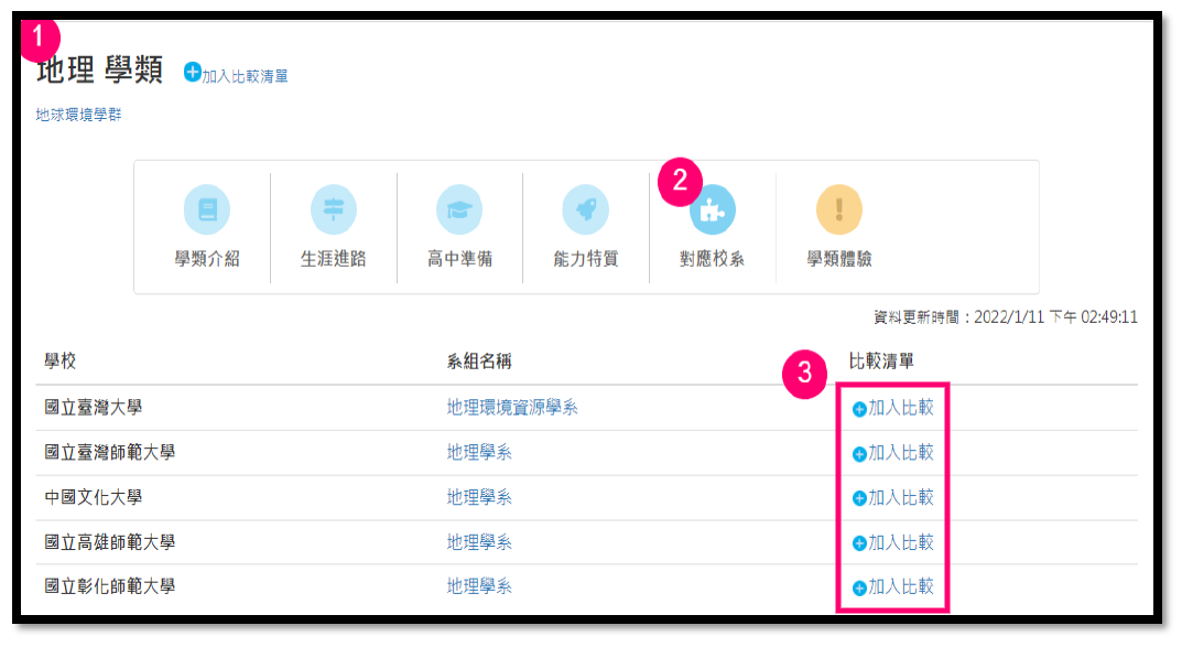 從勾選的學群中,進一步了解學群下的各個學類內涵;此時可善用ColleGo網站中「認識學類」的功能,如果此學類內容符合你的興趣及期待,則可進一步點選【對應校系】,查詢學類下的特定科系資訊,將目標校系加入比較清單。