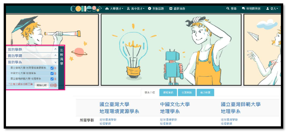 每個學校皆有其獨具的特色、學習文化及周邊資源等,問問自己是否有偏好的學校地區或目標大學;此外,同一個科系不同學校的學習重點及學系特色也不盡相同,這時可運用ColleGo網站的【認識大學】快速連結到各大學網站瀏覽;也要善用ColleGo—比較清單中的【學系比較】功能,可以同時比較三個學系,快速掌握不同學校相同學系間的異同。