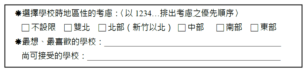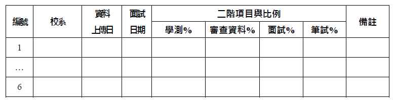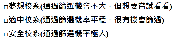 同學根據上述的五個方法逐步篩選出自己想要的目標校系,數量可落在10-20個之間,接著再參考近三年的校系篩選結果一覽表、及本系列專題文章「沒有過去的分數統計,叫我如何選擇志願」一文,評估每個目標校系的屬性: