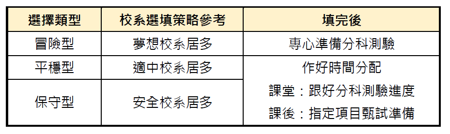 評估所有目標校系的屬性後,若發現夢想校系太多,適中及安全校系太少,可在回到步驟一的5種方法再逐一檢視,擴大校系選擇的範圍。