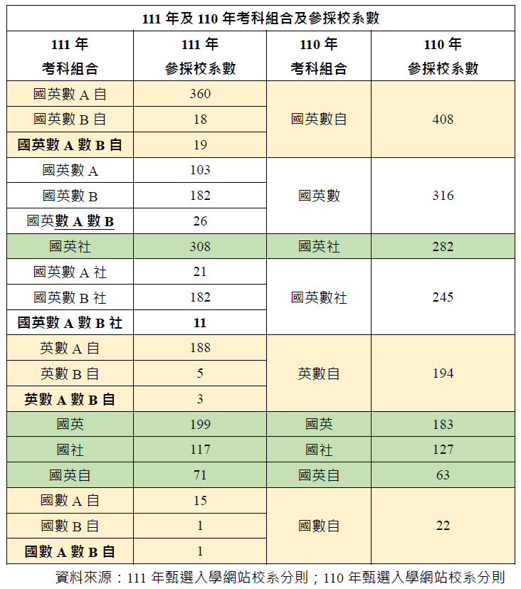 今年的考科組合比往年多了「同時參採數A與數B的考科組合」,這樣的組合,校系並不會同時參採數A及數B的成績,而是只檢定其中一科數學成績,且數學成績不會列入篩選及採計的科目,同學請多留意。