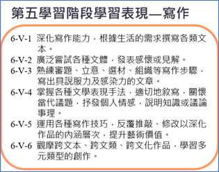 情意的感受抒發能力——(1)具體寫出個人的生活經驗,從中感知聯想、創造抒發。(2)針對問題的情境,真誠抒發個人的情感與體會。