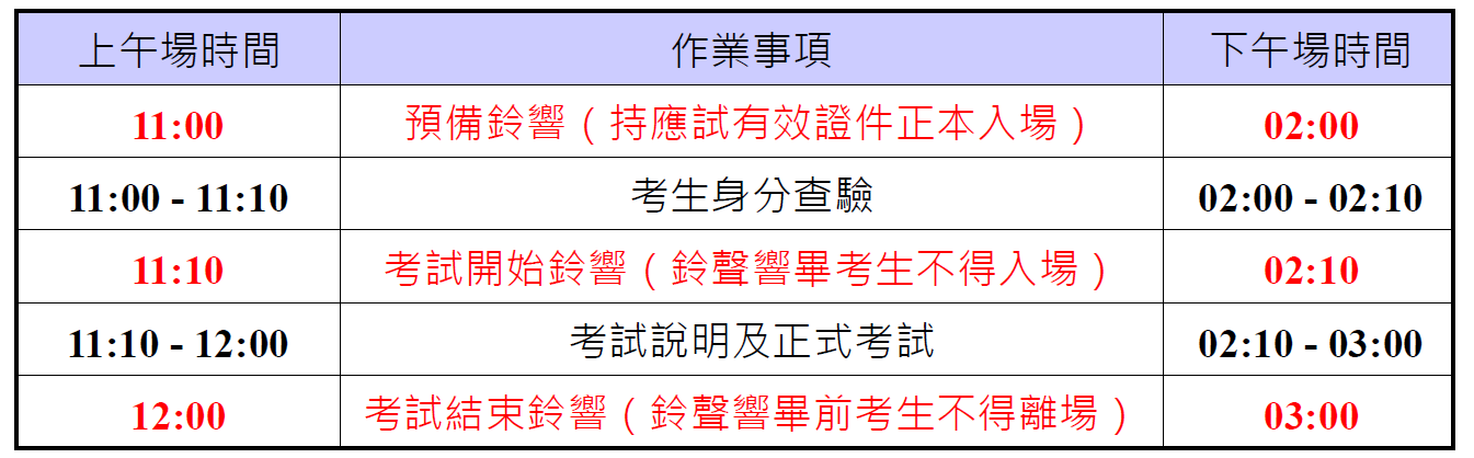 三、 考試時間 各場次自預備鈴響起共計60分鐘。場次方面,原則上第一次考試會視各考試地區之報名人數,安排上、下午場次;第二次考試則原則上只有上午場次。考生之考試場次及試場座位,為本中心統一安排及配置,考生不得指定或要求變更。