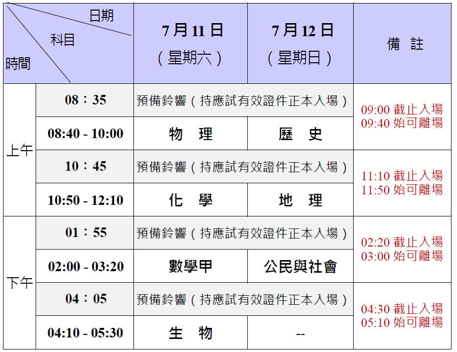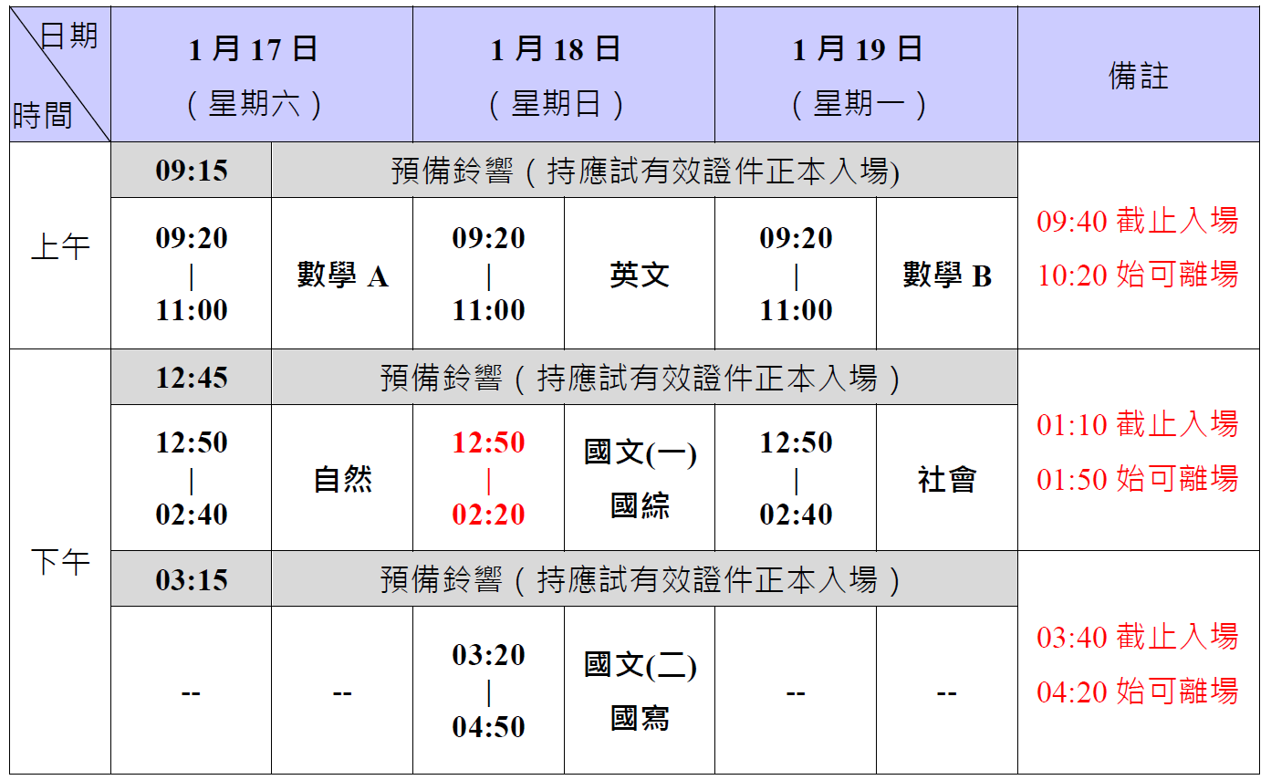 國文考科之國綜、國寫節次各90分鐘;英文、數學A、數學B考科各100分鐘;社會、自然考科各110分鐘。