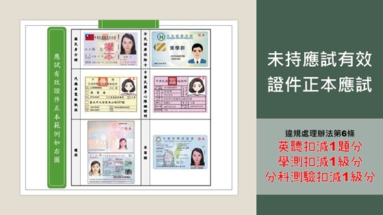 考生未持應試有效證件正本應試,至當節考試結束鈴聲響畢前仍未送達考(分)區試務辦公室或試場者,扣減其該節成績【英聽1題分、學測1級分、分科測驗1級分】。