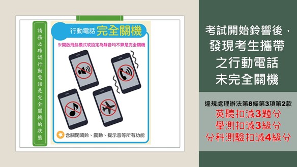 考試開始鈴響後,若發現考生攜帶行動電話未完全關機,不論置放位置,均扣減其該節成績【英聽3題分、學測3級分、分科測驗4級分】。