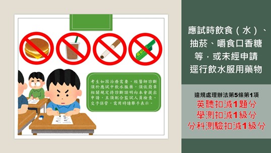 考生於應試時飲食(水)、抽菸、嚼食口香糖等,或未經申請逕行飲水服用藥物,扣減其該節成績【英聽1題分、學測1級分、分科測驗1級分】,制止不聽或經制止後仍再犯者,依情節加重扣分。