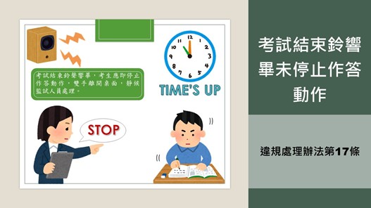 考生於考試結束鈴聲響畢未停止作答動作(包括作答、簽名、增減文字或標點符號,以及擦拭、加黑劃記等)者,視違規情節處置。考試結束鈴聲響畢未停止作答動作,扣減其該節成績【英聽1題分、學測1級分、分科測驗1級分】。