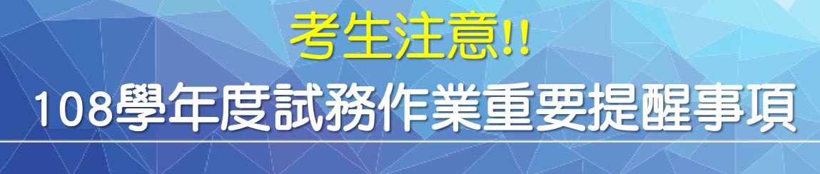 請考生特別注意,本中心各項考試以國民身分證或有照片健保卡或駕駛執照或護照或居留證正本查驗考生身分,考生請於應試前辦妥相關證件並於考試當日攜帶入場應試。若入場應試時未攜帶,且至當節考試結束鈴聲響畢未送達指定地點,則依「違規處理辦法第6條」處置,詳細內容請參考108考試簡章。