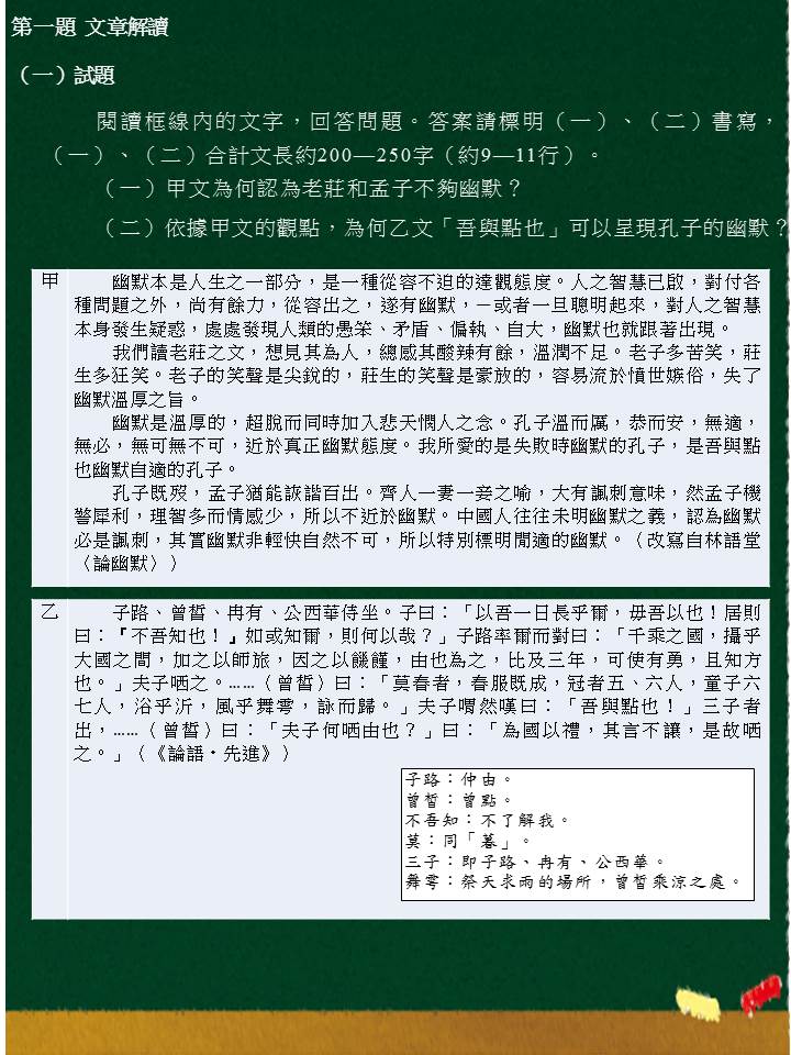 本題提供甲、乙兩段材料,要求考生閱讀後回答問題。第一小題要求考生回答「甲文為何認為老莊和孟子不夠幽默」;第二小題則要求考生依據甲文的觀點,回答「為何乙文『吾與點也』可以呈現孔子的幽默」。試題並設有200~250字(約9~11行)的答題字數限制。