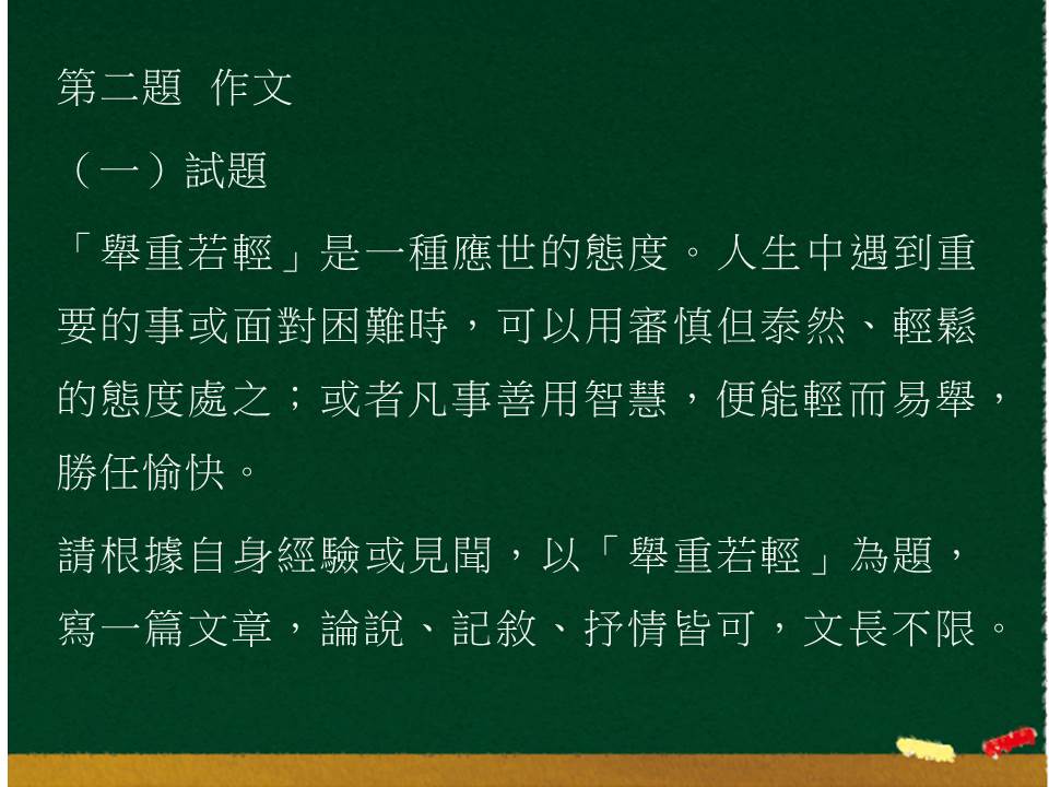 本題另有特殊評分原則:文未終篇,或一段成文者,至多B+(18分);自訂題目,與原題目「舉重若輕」相關者,至多B+(18分);視標點符號之使用與錯別字之多寡,斟酌扣分;完全文不對題或作答內容完全照抄試題者,評給零分。